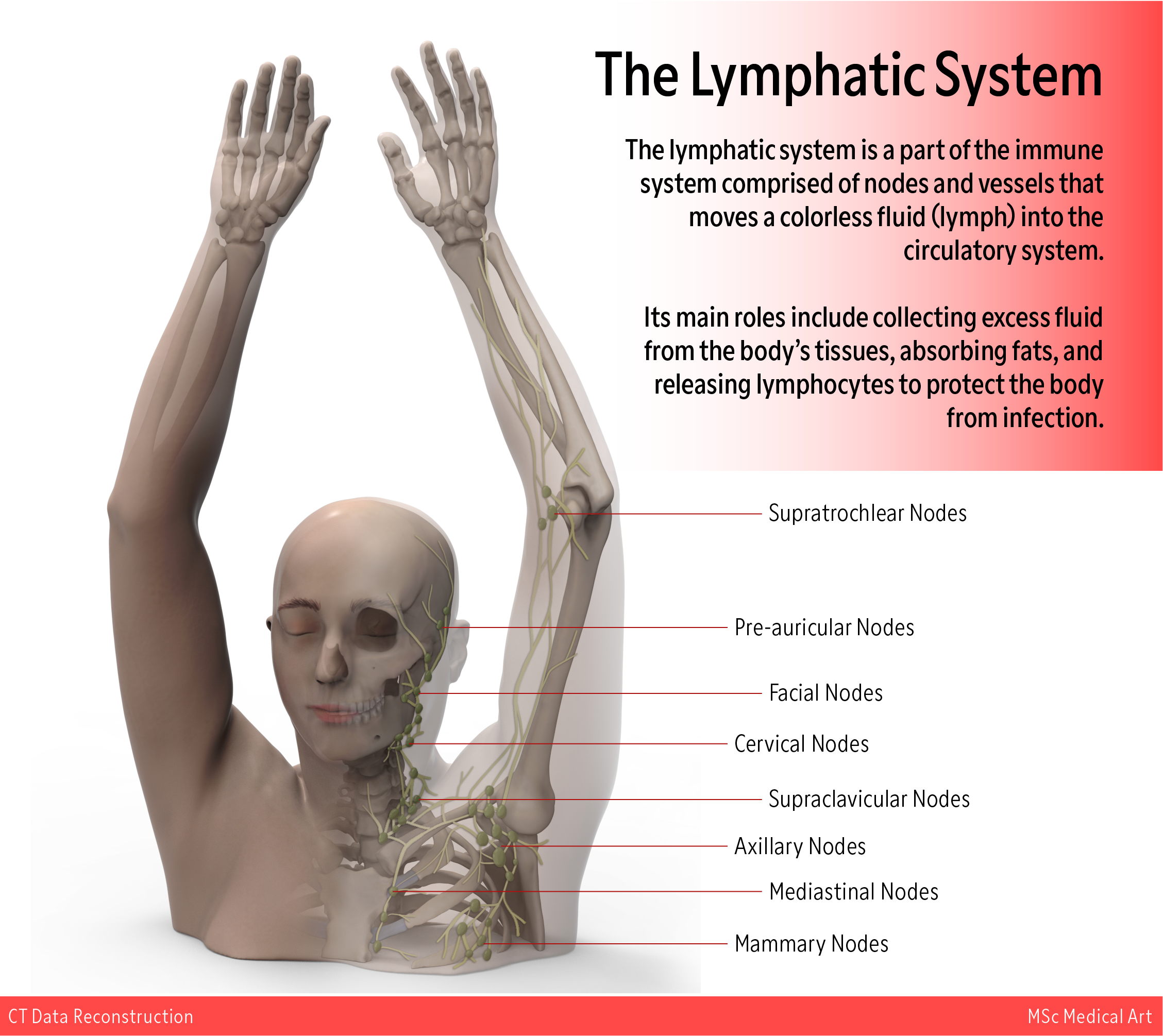 The data was imported into Zbrush and cleaned up (some dental fillings had created artifacts around the mouth, separation of the skin on the fingers, surface smoothing, etc.) and given colour/texture. The finished skeletal and skin layers were then exported as separate images, which were overlaid on top of each other in Photoshop and the skin transparency was adjusted. The lymphatic system was then digitally illustrated and labelled.